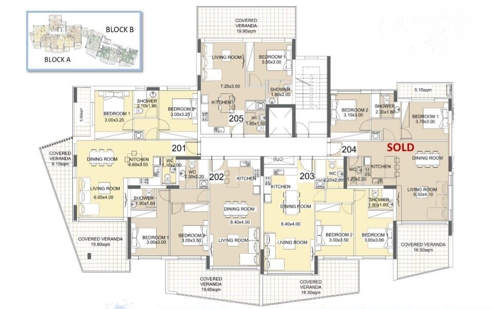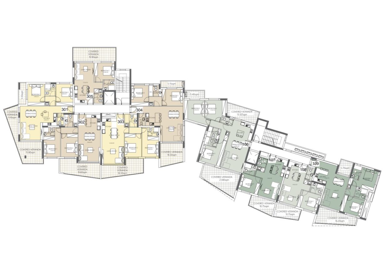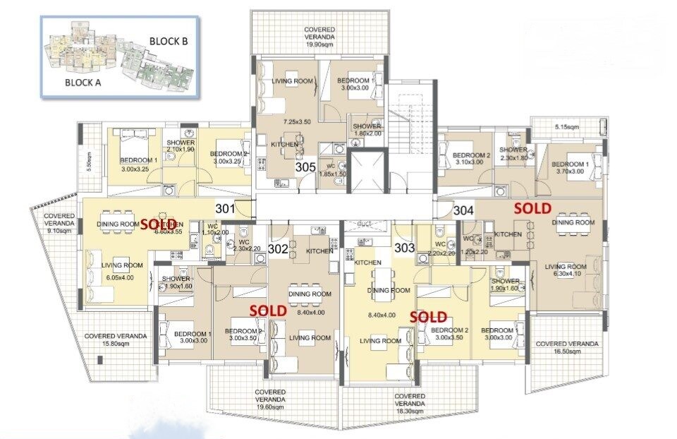 A selection of 1.2 bedrooms apartments in both blocks available for sale with asking price between 220.000- 410.000 euros plus vat.