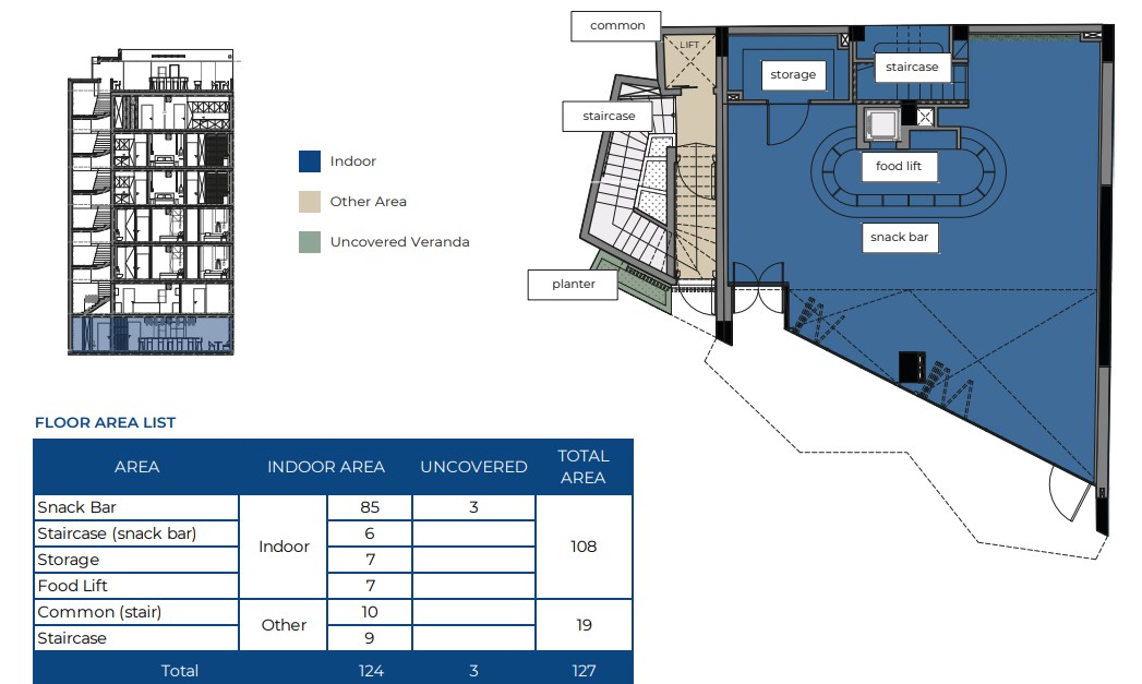On the Ground Floor there is a Snack Bar with Food Lift and Storage space, total area of 127sq.m.