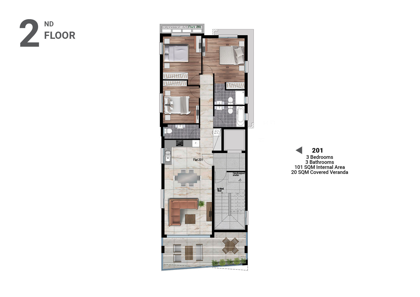 This very modern and unique project is located in one of the most elite and prestigious areas of the town. Just a few minutes drive from Finikoudes and the Patticheio Park, the largest park in town, this amazing project would be a hit among those that they don't settle for the basics. It comprises of three floors with three bedrooms apartments each in every floor and a stunning penthouse on the top floor with large Roof Terrace. The apartments have been meticulously designed with an elevated style, boasted convenience and comfort for the residents. Spectacular views over the neighborhood, generous interiors, balconies and storage facilities.