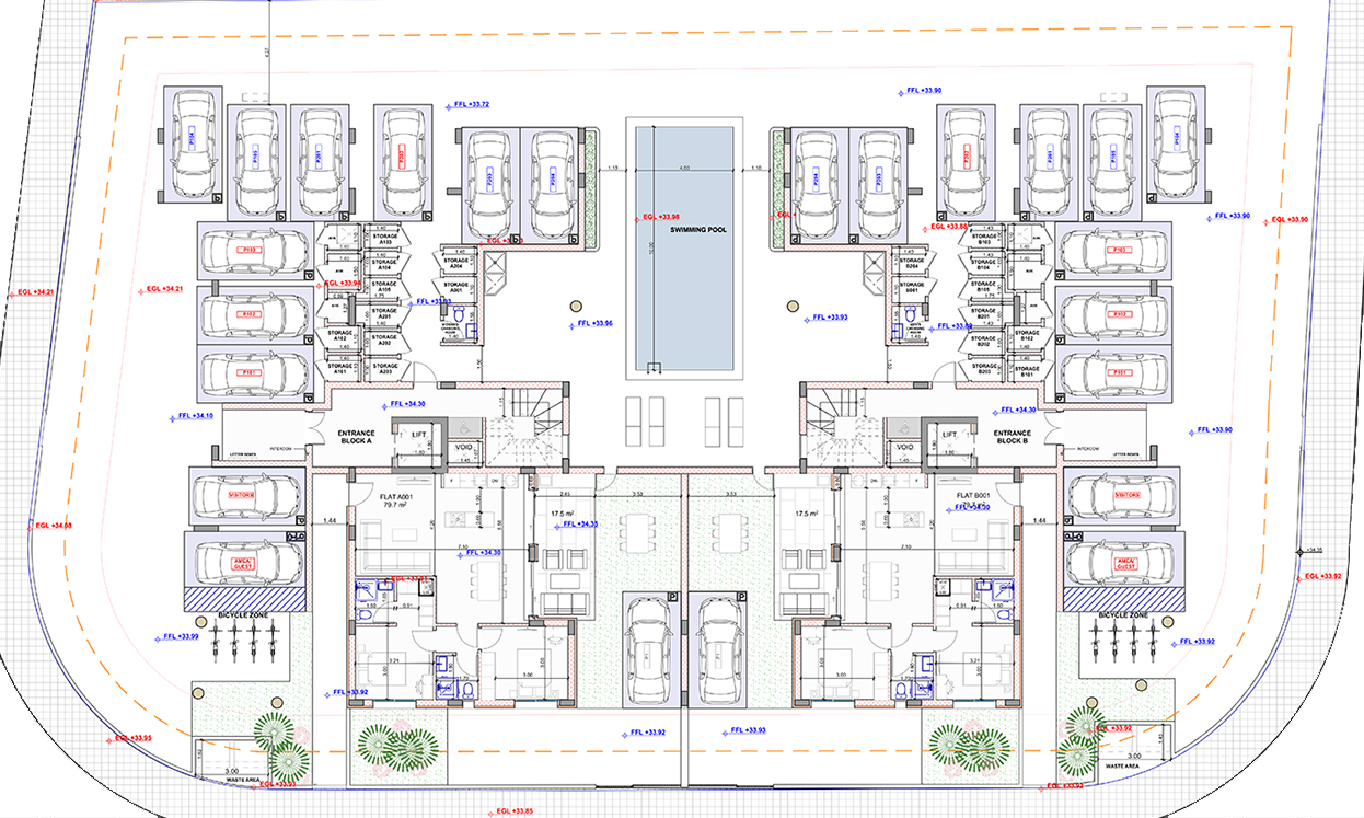 An impressive residential  complex is located  into the most desirable location residential areas in Larnaka. Project consists of 2 separate blocks with luxurious and stylish apartments of 1 or 2 bedrooms. This beautiful complex has a communal swimming pool for the residents only. . It s located in a tranquil  residential area surrounded by villas and houses right next to park. Sea is only 2klm away. Easy access to the highway, and short drive to all local amenities. A nice mixture of one to two bedrooms apartments , some with roof gardens.